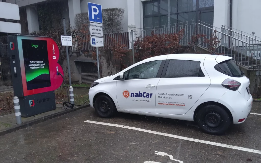 Durch die Kooperation der Stadt Hofheim, der bidirex GmbH aus Neuenburg und uns als nahCar Betreiber kann das nahCar Fahrzeug am Rathaus in Hofheim an einer eigens dafür reservierten bidirex Ladesäule geladen werden. Um den Ladevorgang für das nahCar an der bidirex Ladesäule zu autorisieren, liegt eine entsprechende Ladekarte von bidirex im Fahrzeug. Schließen Sie das Fahrzeug an die Ladesäule an und autorisieren Sie den Ladevorgang mit dieser Ladekarte. Im Anschluss stecken Sie bitte die Ladekarte wieder in das dafür vorgesehen Fach im Handschuhfach.