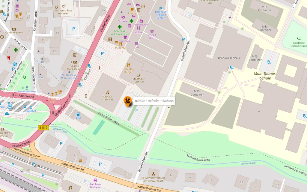 Das nahCar Fahrzeug steht hinter dem Rathaus auf dem Parkplatz an der Rudolf-Mohr-Straße an einer reservierten bidirex Ladesäule bereit. Hier holen Sie das nahCar ab und bringen es auch wieder hierher zurück.
