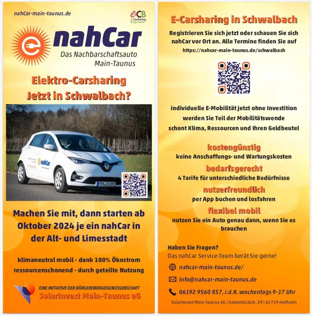 Die ersten Versuche unser nahCar in Schwalbach zu etablieren starteten bereits im Sommer 2021. In diesen fast drei Jahren gab es immer wieder Schwierigkeiten, die uns davon abgehalten haben ein nahCar in Schwalbach zu starten. Mit unserer Kampagne in 2024 wollten wir dies ändern und mit 2 nahCars in Schwalbach starten. Leider ist es uns nicht gelungen genügend Bürger*innen in Schwalbach für unser nahCar verbindlich zugewinnen. Daher enden hier unsere Aktivitäten für Schwalbach.